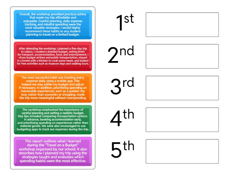 This report outlines what I learned during the "Travel on a Budget" workshop organized by our school. It also describes how I planned my trip using the strategies taught and evaluates which spending habits were the most effective., The workshop emphasized the importance of careful planning and setting a realistic budget. Key tips included comparing transportation options in advance, booking accommodation early, and prioritizing spending on experiences rather than material goods. We were also encouraged to use budgeting apps to track our expenses during the trip., After attending the workshop, I planned a five-day trip to Lisbon. I created a detailed budget, setting limits for transport, accommodation, food, and entertainment. I chose budget airlines and public transportation, stayed in a hostel with a kitchen to cook some meals, and looked for free activities such as museum days and walking tours., The most successful habit was tracking every expense daily using a mobile app. This helped me stay within my budget and adjust if necessary. In addition, prioritizing spending on memorable experiences, such as a guided city tour, rather than souvenirs or shopping, made the trip more meaningful without overspending., Overall, the workshop provided practical advice that made my trip affordable and enjoyable. Careful planning, daily expense tracking, and mindful spending were the most valuable strategies. I would highly recommend these habits to any student planning to travel on a limited budget..