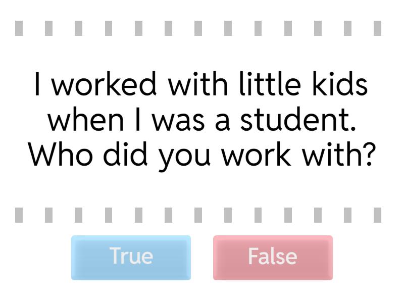 True: I worked with little kids when I was a student. Who did you work with?, She offered me a generous piece of pizza. What did she offer me?, She offered me a generous piece of pizza. Who offered a generous piece of pizza?, She left him for good. Who left him?, She left him for good! Who did she leave?, They lost all my money! What did they lose?, I bumped into Santa the other day! Who did you bump into?, I bumped into Santa the other day! Who bumped into Santa?, False: I worked with little kids when I was a student. Who you worked with?, She offered me a generous piece of pizza. What she offered me?, She offered me a generous piece of pizza. Who did offer a generous piece of pizza?, She left him for good. Who did leave him?, She left him for good. Who she left?, They lost all my money! What they lost?, I bumped into Santa the other day! Who you bumped into?, I bumped into Santa the other day! Who did bumped into Santa?,