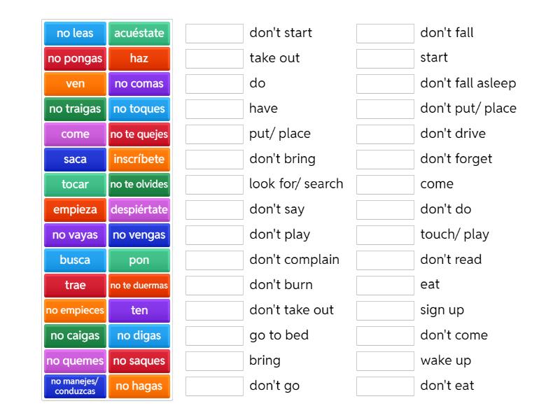 come - eat, no comas - don't eat, no vayas - don't go, no vengas - don't come, ven - come, busca - look for/ search, trae - bring, no leas - don't read, empieza - start, no empieces - don't start, tocar - touch/ play, no toques - don't play, saca - take out, no saques - don't take out, pon - put/ place, no pongas - don't put/ place, haz - do, ten - have, no hagas - don't do, no digas - don't say, no te quejes - don't complain, no te olvides - don't forget, no quemes - don't burn, no manejes/ conduzcas - don't drive, no te duermas - don't fall asleep, acuéstate - go to bed, despiértate - wake up, inscríbete - sign up, no caigas - don't fall, no traigas - don't bring,