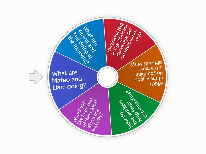1) What are Amina and Mei doing at the moment? 2) Who works outdoors and who works indoors? Why is that important? 3) Which of these jobs do you think is the most difficult? Why? 4) How do the workers help their communities? 5) Would you like to do one of these jobs? Which one and why? 6) What are Mateo and Liam doing?