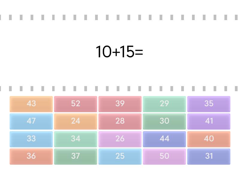 25 - 10+15=, 28 - 12+16=, 24 - 13+11=, 30 - 17+13=, 26 - 14+12=, 31 - 16+15=, 29 - 18+11=, 36 - 22+14=, 35 - 19+16=, 47 - 22+25=, 39 - 21+18=, 43 - 26+17=, 37 - 23+14=, 50 - 25+25=, 44 - 17+27=, 34 - 23+11=, 40 - 20+20=, 41 - 28+13=, 33 - 19+14=, 52 - 21+31=,