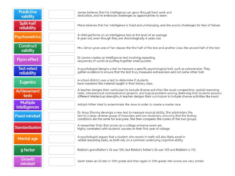 Standardization - Dr. Anya Sharma develops a new test to measure musical ability. She administers the test to a large, diverse group of musicians and non-musicians, ensuring that the testing conditions are the same for everyone. She then compares the scores of the two groups., Achievement tests - A school district uses a test to determine if students have mastered the material taught in their history class., Test-retest reliability - Sarah takes an IQ test in 10th grade and then again in 12th grade. Her scores are very similar., Predictive validity - A researcher finds that scores on a college entrance exam are highly correlated with students' success in their first year of college., Fixed mindset - Maria believes that her intelligence is fixed and unchanging, and she avoids challenges for fear of failure., Growth mindset - James believes that his intelligence can grow through hard work and dedication, and he embraces challenges as opportunities to learn., Construct validity - A psychologist designs a test to measure a specific psychological trait, such as extraversion. They gather evidence to ensure that the test truly measures extraversion and not some other trait., Psychometrics - Dr. Levine creates an intelligence test involving repeating sequences of words or putting together small puzzles, Split-half reliability - Mrs. Simon gives one of her classes the first half of the test and another class the second half of the test, Flynn effect - Robbie's grandfather's IQ was 100, but Robbie's father's IQ was 105 and Robbie's is 110., Eugenics - Adolph Hitler tried to exterminate the Jews in order to create a master race, Mental age - A child performs on an intelligence test at the level of an average 8-year-old, even though they are chronologically 6 years old., g factor - A psychologist argues that a student who excels in math will also likely excel in verbal reasoning tasks, as both rely on a common underlying cognitive ability., Multiple intelligences - A teacher designs their curriculum to include diverse activities like music composition, spatial reasoning tasks, interpersonal communication projects, and logical problem-solving, believing that students possess different intellectual strengths.A teacher designs their curriculum to include diverse activities like music,