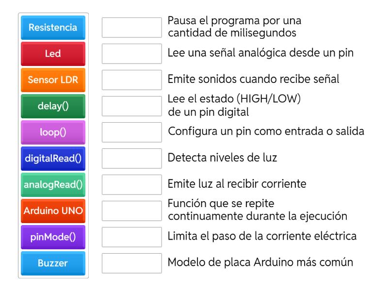 Led - Emite luz al recibir corriente, Resistencia - Limita el paso de la corriente eléctrica, Arduino UNO - Modelo de placa Arduino más común, Sensor LDR - Detecta niveles de luz, Buzzer - Emite sonidos cuando recibe señal, pinMode() - Configura un pin como entrada o salida, digitalRead() - Lee el estado (HIGH/LOW) de un pin digital, analogRead() - Lee una señal analógica desde un pin, delay() - Pausa el programa por una cantidad de milisegundos, loop() - Función que se repite continuamente durante la ejecución,