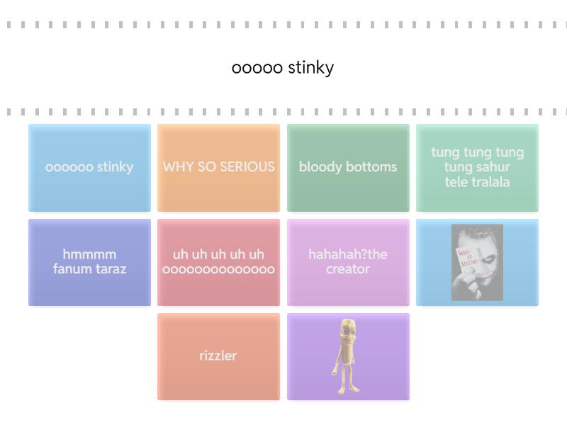 oooooo stinky - ooooo stinky, uh uh uh uh uh oooooooooooooo - uh uh uh uh uh oooooooooooooooo, WHY SO SERIOUS - why so serious, bloody bottoms - bloody bottoms, hahahah?the creator - hahahahah?the creator, hmmmm fanum taraz - hmmmmm fanum taraz, tung tung tung tung sahur tele tralala - tung tung tung tung sahur tele trala, rizzler - rizzler,