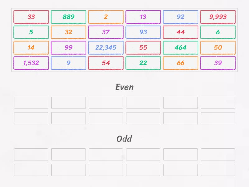Even: 2, 6, 50, 92, 54, 44, 464, 14, 22, 32, 1,532, 66, Odd: 5, 9, 99, 13, 37, 9,993, 55, 39, 33, 22,345, 93, 889,