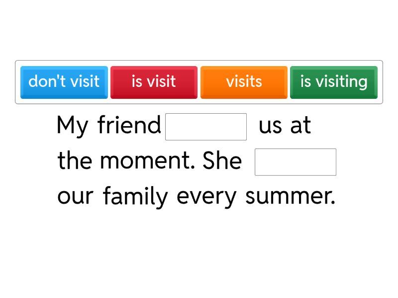 My friend____ us at the moment. She ____ our family every summer. Her name is Jodie and she ____ playing the piano. Can you hear her? She ____ the piano for my parents downstairs. I'm sure my parents ____ the music. They never ____ to live music!