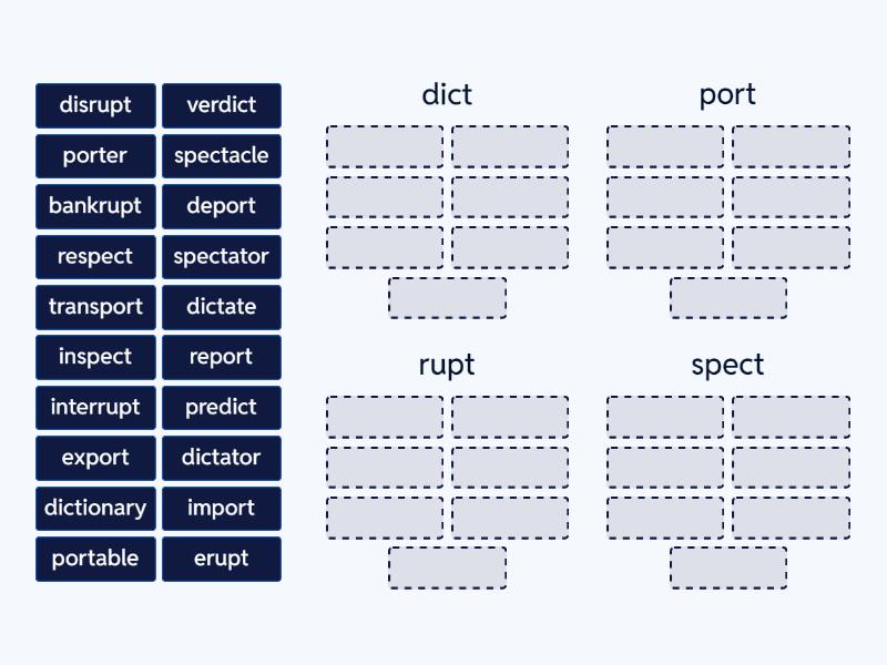 dict: predict, dictate, dictator, verdict, dictionary, port: export, porter, report, deport, import, portable, transport, rupt: erupt, bankrupt, interrupt, disrupt, spect: inspect, respect, spectacle, spectator,