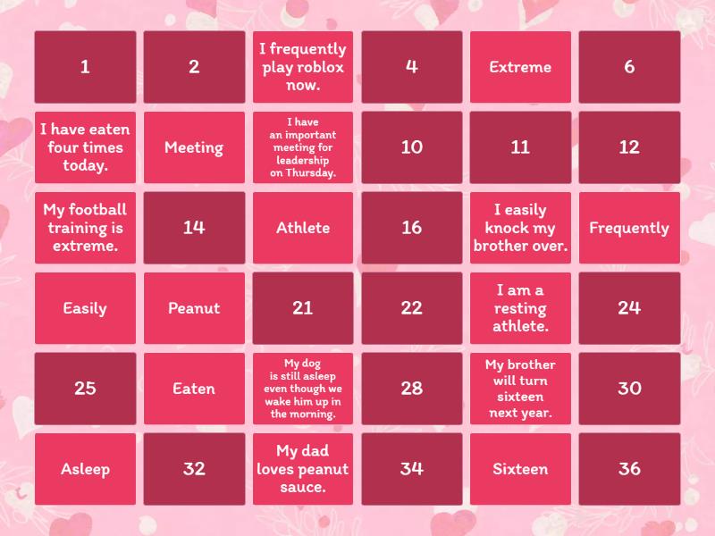 Extreme  - My football training is extreme. , Athlete - I am a resting athlete. , Frequently - I frequently play roblox now. , Easily  - I easily knock my brother over. , Eaten - I have eaten four times today. , Peanut  - My dad loves peanut sauce. , Sixteen - My brother will turn sixteen next year. , Asleep - My dog is still asleep even though we wake him up in the morning. , Meeting - I have an important meeting for leadership on Thursday. , Relieve  - I am relieved that school is over for the day. , Believe - I believe that I can fly. , Achieve - One day I will achieve a selection in the AFLW. , Donkey  - He is just a donkey. , Valley - I live in a valley. , Kidney - My dad always says that when my mum goes shopping he will have to sell his kidney. , Badly  - I badly hurt my arm. , Activity  - My favourite activity is sleeping. , Battery  - My battery is always low. ,