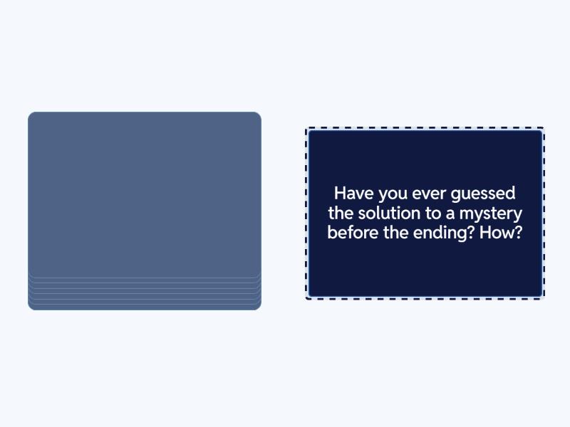 Do you like reading/watching fiction? What do you prefer science fiction/psychological/crime?, What do you think of when you hear the word "crime"?, Do you think it’s easy or hard to solve a crime? Why?, Have you ever read a book or watched a movie about a detective or a criminal? , What qualities make someone a good detective?, Have you ever guessed the solution to a mystery before the ending? How?, Do you prefer stories with a surprise ending or where you can guess the ending? Why?, In your opinion, What makes a crime story exciting or boring?.