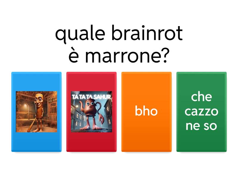1) quale brainrot è marrone?  a) b) c) bho d) che cazzo ne so 2) Quale brainrot bestemmia sempre a) Trallallero trallala b) garamramram 3) quale brainrot preferisci? a) tututu sahur b) trallallero trallala c) shimpanzini bananini d) bombardino croccodilo 4) Chi bombarda gaza? a) israele b) bombardino croccodilo c) trump 5) In quale social ti appare spesso i brainrot? a) tiktok b) Yt c) Facebook d) instagram