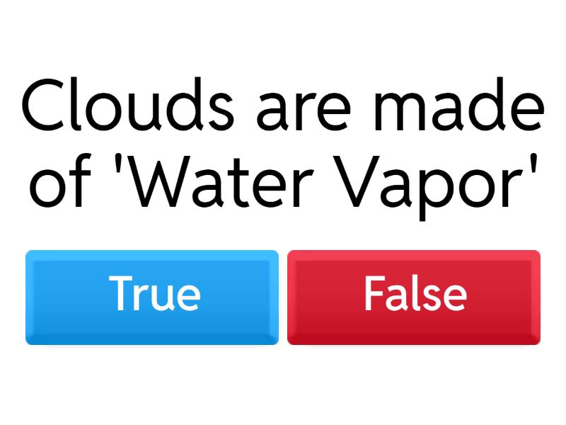 1) Clouds are made of 'Water Vapor' a) True b) False 2) Clouds come in many different shapes and sizes a) True b) False 3) Cirrus a) b) 4) Cumulus a) b) 5) Stratus a) b)