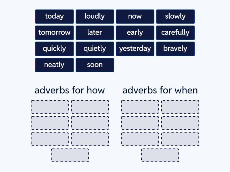 adverbs for how: slowly, quickly, carefully, neatly, quietly, loudly, bravely, adverbs for when: soon, later, early, now, today, yesterday, tomorrow,