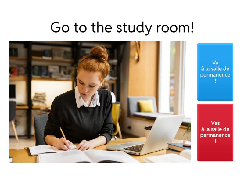 1) Go to the study room! a) Va à la salle de permanence ! b) Vas à la salle de permanence ! 2) Open your pencil case! a) Ouvres ta trousse ! b) Ouvre ta trousse ! 3) Pronounce the H! a) Prononces le H ! b) Prononce le H ! 4) Wait for the teacher! a) Attend le professeur ! b) Attends le professeur ! 5) Close your book! a) Ferme ton livre ! b) Fermes ton livre ! 6) Eat your lunch! a) Mange ton déjeuner ! b) Manges ton déjeuner ! 7) Go to the classroom! a) Va à la salle de classe ! b) Vas à la salle de classe ! 8) Come in! a) Entre ! b) Entres ! 9) Don't speak! a) Ne parle pas ! b) Ne parles pas ! 10) Don't forget your bag! a) N'oublie pas ton sac ! b) N'oublies pas ton sac ! 11) Don't open your computer! a) N'ouvre pas ton ordinateur ! b) N'ouvres pas ton ordinateur ! 12) Work in silence! a) Travaille en silence ! b) Travailles en silence ! 13) Start your homework! a) Commence tes devoirs ! b) Commences tes devoirs ! 14) Don't lose your pen! a) Ne perd pas ton stylo ! b) Ne perds pas ton stylo ! 15) Answer in French ! a) Répond en français ! b) Réponds en français ! 16) Talk to the teacher! a) Parle au professeur ! b) Parles au professeur !