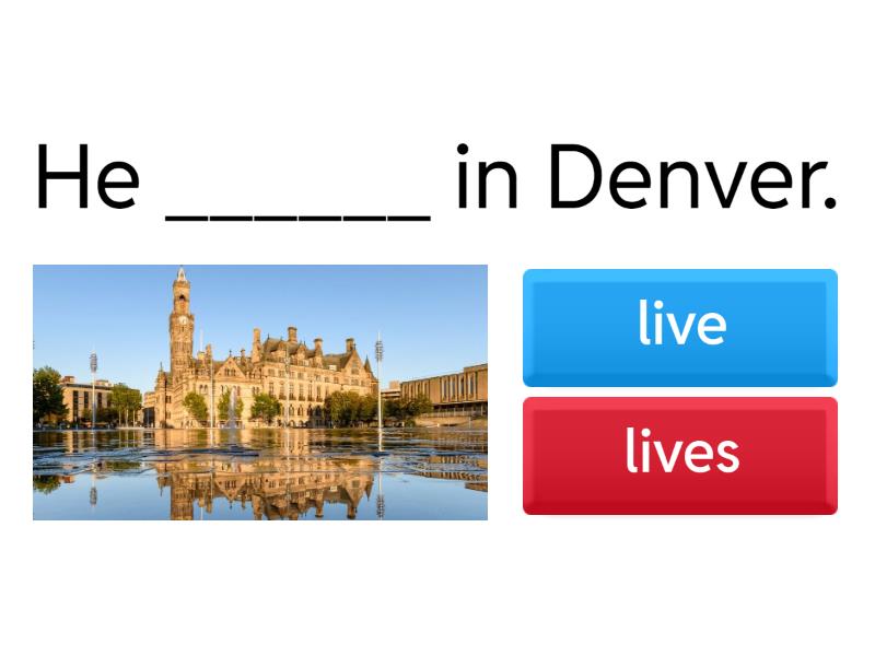 1) He ______ in Denver. a) live b) lives 2) I ______ in Aurora. a) live b) lives 3) She _________ coffee and cake. a) likes b) like 4) We ______ Colorado. a) like b) likes 5) Karim ________ soccer. a) play b) plays 6) Rahima ______ coffee. a) drink b) drinks 7) ___ goes to the cinema. a) He b) We c) They 8) ____ have a kitten. a) She b) Abu c) They 9) _____ likes pasta. a) I b) Ali c) They 10) _______ comes from Syria. a) We b) Mohamad c) Hallie and Harris 11) _____ likes fish. a) My cats b) They c) My cat 12) _______ like rain. a) My dogs b) He c) My dog