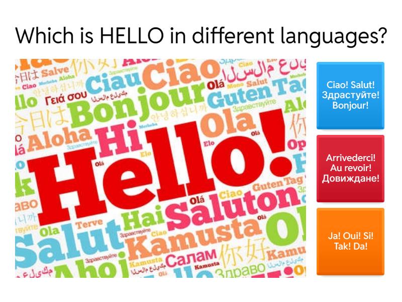 1) Which is English language? a) b) c) 2) Which is French language? a) b) c) 3) Which is Thai language? a) b) c) d) 4) Which is Italian language? a) b) c) 5) Which is Vietnamese language? a) b) c) d) 6) Which is Korean language? a) b) c) 7) Which is Japanese language? a) b) c) 8) Which is Spanish language? a) b) c) 9) Which is Chinese language? a) b) c) 10) Which is HELLO in different languages? a) Arrivederci! Au revoir! Довиждане!  b) Ciao! Salut! Здрастуйте! Bonjour! c) Ja! Oui! Si! Tak! Da!