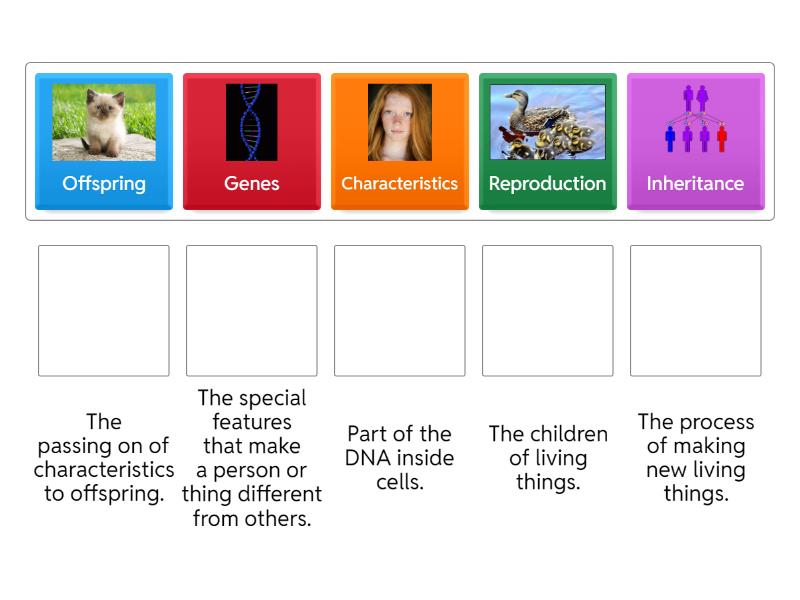 Reproduction - The process of making new living things., Offspring - The children of living things., Characteristics - The special features that make a person or thing different from others., Genes - Part of the DNA inside cells., Inheritance - The passing on of characteristics to offspring.,