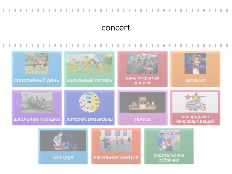 концерт - concert, распродажа ненужных вещей - jumble sale, мюзикл - musical, родительское собрание - parents' evening, пьеса - play, лотерея, розыгрыш - raffle, школьный лагерь - school camp, школьная секция - school club, школьная поездка - school trip, спортивный день - sports day, день открытых дверей - open day,