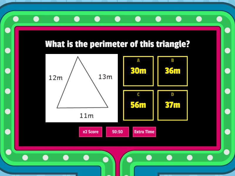 1) What is the perimeter of this triangle? a) 30m b) 36m c) 56m d) 37m 2) What is the perimeter of this square? a) 20m b) 15m c) 16m d) 22m 3) What is the perimeter of this rectangle? a) 76cm b) 70cm c) 78cm d) 68cm 4) What is the perimeter of this square? a) 220cm b) 200cm c) 218cm d) 240cm 5) What is the perimeter of this hexagon? a) 100cm b) 90cm c) 45cm d) 75cm 6) Bob is going to run five times around the perimeter of her local park. The park is a square with one side measuring 30m. What is the total distance he will run? a) 120m b) 600m c) 30m d) 60m 7) A farmer wants to build a fence in her garden. One side of the fence is 23m, the second side is 26m and the third side is 33m. What is the perimeter of the fence? a) 81m b) 62m c) 72m d) 82m 8) What is the perimeter? a) 15cm b) 15 c) 15m 9) What is the perimeter? a) 69m b) 68m c) 70m d) 67m