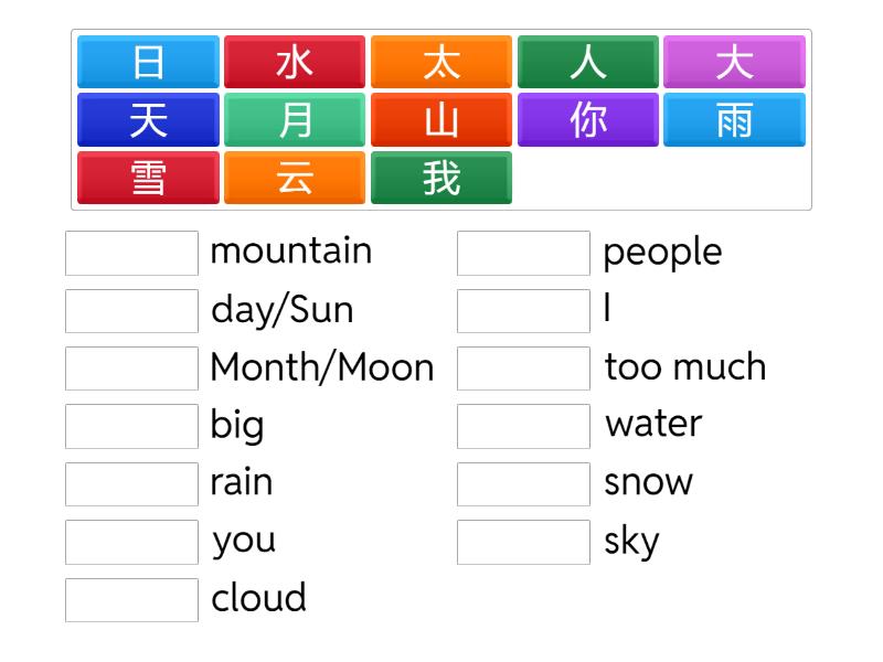人 - people, 大 - big, 天 - sky, 我 - I, 你 - you, 云 - cloud, 日 - day/Sun, 月 - Month/Moon, 太 - too much, 雨 - rain, 雪 - snow, 山 - mountain, 水 - water,