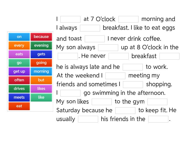 I ____ at 7 O'clock ____ morning and I always ____ breakfast. I like to eat eggs and toast ____ I never drink coffee. My son always ____ up at 8 O'clock in the ____. He never ____ breakfast ____ he is always late and he ____ to work. At the weekend I ____ meeting my friends and sometimes I ____ shopping. I ____ go swimming in the afternoon. My son likes ____ to the gym ____ Saturday because he ____ to keep fit. He usually ____ his friends in the ____.