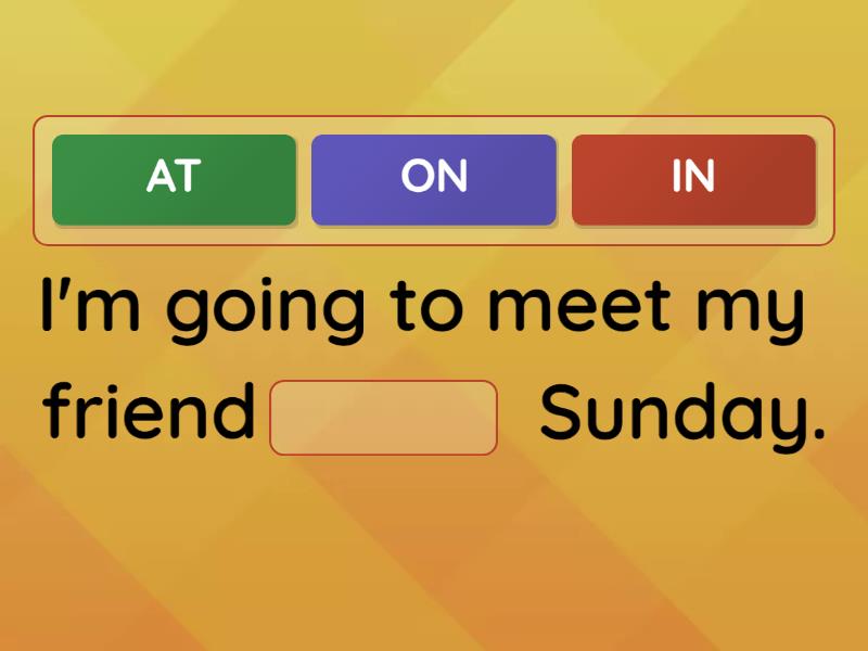 I'm going to meet my friend____ Sunday. We have a lot of parties ____ Christmas. We met ____ 1992. I was born ____ 29th March. Dad will come ____ a minute The supermarket closes ____ 9 pm. Her birthday is ____ July. I have lived ____ London for ten years. I have an English class____ Wednesday and Friday. She likes playing computer games ____ the evenings. You can see stars in the sky ____ night. My brother works in a restaurant ____ the afternoon. We usually go to the cinema ____ Fridays. It is usually snowy ____ winter. Are you free ____ the weekend? The school year ends ____ 25th June. He lives ____ 21 Cambridge Gardens. We celebrate Christmas ____ December. The shops are closed ____ Easter day. Petra usually takes a nap ____ the afternoon. Sam has breakfast ____ 8.30 in the morning. I go to the beach ____ summer. My best friend lives ____ Hong Kong. I always go to Marks and Spencers____ Oxford Street.