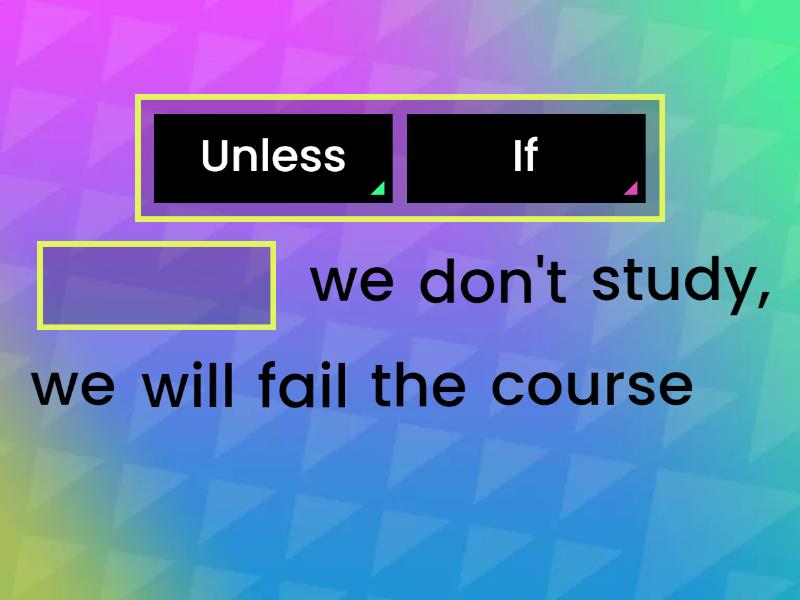 ____ we don't study, we will fail the course If I had known you didn't have time, I ____ have told you to come I'll make some food If you ____ tonight We'll go to the park ____ it rains If only I ____ my homework better What ____ you ____ If you ____ the accident? (Third conditional) Do you ____ happy when you don't play? They ____ If they ____ there. (Third conditional) I ____ more languages If I ____ time If only I ____ that car when I had the money
