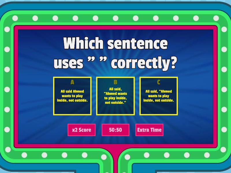 1) Which sentence uses " " correctly? a) Ali said Ahmed wants to play inside, not outside. b) Ali said, "Ahmed wants to play inside, not outside." c) Ali said, "Ahmed wants to play inside, not outside. 2) Which sentence uses " " correctly? a) "Which store do you want to go to?" asked Marie. b) Which store do you want to go to? asked Marie. c) "Which store do you want to go to? asked Marie. 3) Which sentence uses " " correctly? a) "Is that your dog?" he asked. b) "Is that your dog." he asked. c) "Is that your dog," he asked. 4) Which sentence uses " " correctly? a) "Can I borrow an umbrella? asked Ali, it is raining outside." b) "Can I borrow an umbrella?" asked Ali, it is raining outside." c) "Can I borrow an umbrella?" asked Ali, "It is raining outside." 5) Which sentence uses " " correctly? a) Where will you go? she asked. b) "Where will you go?" she asked. c) "Where will you go? she asked. 6) Which sentence uses " " correctly? a) "omar said i love cats?" b) Omar said, "i love cats" c) Omar said, "I love cats." 7) Which sentence uses " " correctly? a) "I love to eat pizza"! Peter said. b) "I love to eat pizza!" Peter said. c) "I love to eat pizza," Peter said. 8) Which sentence uses " " correctly? a) Lina said, "Give me my book." b) Lina said, "Give me my book c) Lina said, "Give me my book. 9) Which sentence uses " " correctly? a) "Are we there yet?" asked the kids. b) "Are we there yet? asked the kids. c) "Are we there yet," asked the kids. 10) Which sentence uses " " correctly? a) "I am visiting my grandma," said Red Cap, "and these flowers are for her." b) "I am visiting my grandma, said Red Cap, and these flowers are for her." c) "I am visiting my grandma" said Red Cap, "and these flowers are for her."