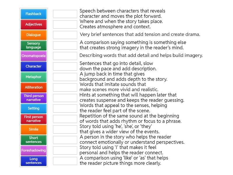 Metaphor - A comparison saying something is something else that creates strong imagery in the reader's mind., Simile - A comparison using 'like' or 'as' that helps the reader picture things more clearly., Alliteration - Repetition of the same sound at the beginning of words that adds rhythm or focus to a phrase., Character - A person in the story who helps the reader connect emotionally or understand perspectives., Setting - Where and when the story takes place. Creates atmosphere and context., Short sentences - Very brief sentences that add tension and create drama., Long sentences - Sentences that go into detail, slow down the pace and add description., First person narrative - Story told using 'I' that makes it feel personal and helps the reader connect., Third person narrative - Story told using 'he', 'she', or 'they' that gives a wider view of the events., Foreshadowing - Hints at something that will happen later that creates suspense and keeps the reader guessing., Flashback - A jump back in time that gives background and adds depth to the story., Dialogue - Speech between characters that reveals character and moves the plot forward., Onomatopoeia - Words that imitate sounds that make scenes more vivid and realistic., Sensory language - Words that appeal to the senses, helping the reader feel part of the scene., Adjectives - Describing words that add detail and helps build imagery.,