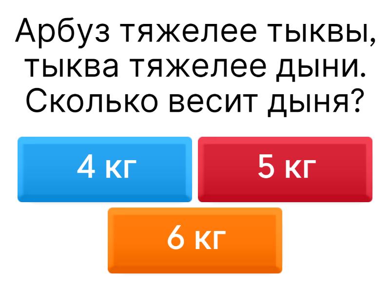 1) Арбуз тяжелее тыквы, тыква тяжелее дыни. Сколько весит дыня? a) 4 кг b) 5 кг c) 6 кг 2) Шоколадка дороже мороженого, мороженое дороже пироженого. Сколько стоит шоколадка? a) 30 руб. b) 50 руб. c) 70 руб. 3) Мальчики смотрели мультик "Ну,погоди!", а девочки "Дюймовочка". Какой мультик смотрела Таня? a) Ну, погоди! b) Дюймовочка c) Русалочка 4) На клумбе тюльпанов больше, чем нарциссов, а нарциссов больше, чем анютиных глазок. Каких цветов больше всего? a) Нарциссы b) тюльпаны c) анютины глазки 5) Миша выше Толи, Толя выше Ромы. Кто самый высокий? a) Миша b) Толя c) Рома 6) Ира ниже Оли, Оля ниже Ани. Как зовут самую низкую девочку? a) Аня b) Оля c) Ира