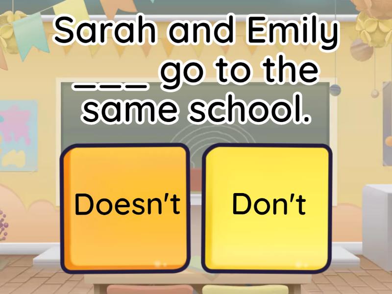 1) Sarah and Emily ___ go to the same school. a) Doesn't  b) Don't 2) My brother ___ play video games every day. a) Doesn't b) Don't 3) Iguanas ___ live in cold places.  a) Doesn't b) Don't 4) Tom ___ enjoy watching horror movies.  a) Doesn't b) Don't 5) Jorge and his friends ___ like playing soccer.  a) Doesn't b) Don't 6) It ___ rain a lot in the desert.  a) Doesn't b) Don't 7) The students ___ like the homework.  a) Doesn't b) Don't 8) Mrs. Johnson ___ teach math.  a) Doesn't b) Don't 9) I ___ need a ticket to buy in the cafeteria. a) Doesn't b) Don't 10) This book ___ belong to my friend. a) Doesn't b) Don't 11) We ___ always have homework on Fridays. a) Doesn't b) Don't 12) She ___ know how to speak Spanish. a) Doesn't b) Don't 13) The teachers ___ use old computers.  a) Doesn't b) Don't 14) Alex and Marcela ___ go to the auditorium. a) Doesn't b) Don't 15) Your cousins ___ visit you during vacation. a) Doesn't b) Don't 16) My cat ___ sleep all day.  a) Doesn't b) Don't