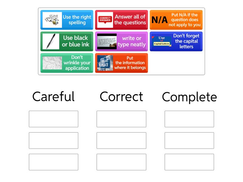 Careful: Don't wrinkle your application , Use black or blue ink, write or type neatly, Correct: Use the right spelling, Don't forget the capital letters, Put the information where it belongs, Complete: Answer all of the questions, Put N/A if the question does not apply to you,