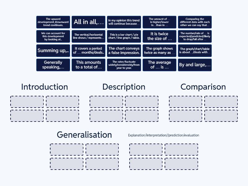 Introduction: The graph/chart/table is about…/deals with…, It covers a period of … months/deals.., This is a bar chart / pie chart / line graph / table., The vertical/horizontal line shows / represents…, Description: The upward development /downward trend continues., The rates fluctuate widely/considerably/from year to year., The average of … is …, This amounts to a total of…, Comparison: Comparing the different data with each other we can say that…, The amount of … is higher/lower in…than in …, The graph shows twice as many as …, It is twice the size of …, Generalisation: Generally speaking,…, By and large,…, All in all,…, Summing up,.., Explanation/interpretation//prediction/evaluation: We can account for this development by looking at.., The number/rate of … is expected/predicted/likely to drop/fall after …, In my opinion this trend will continue because…, The chart conveys a false impression.,