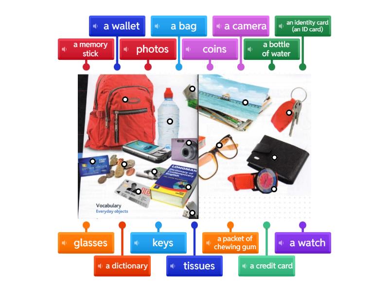 a bag, photos, glasses, a bottle of water, a camera, a wallet, a credit card, a dictionary, a watch, keys, a memory stick, a packet of chewing gum, an identity card (an ID card), coins, tissues.