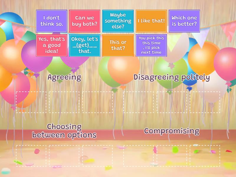 Agreeing: Yes, that's a good idea!, Okey, let's _(get)__ that., I like that!, Disagreeing politely: I don't think so., Maybe something else?, Choosing between options: This or that?, Which one is better?, Compromising : You pick this this time , I'll pick next time, Can we buy both?,