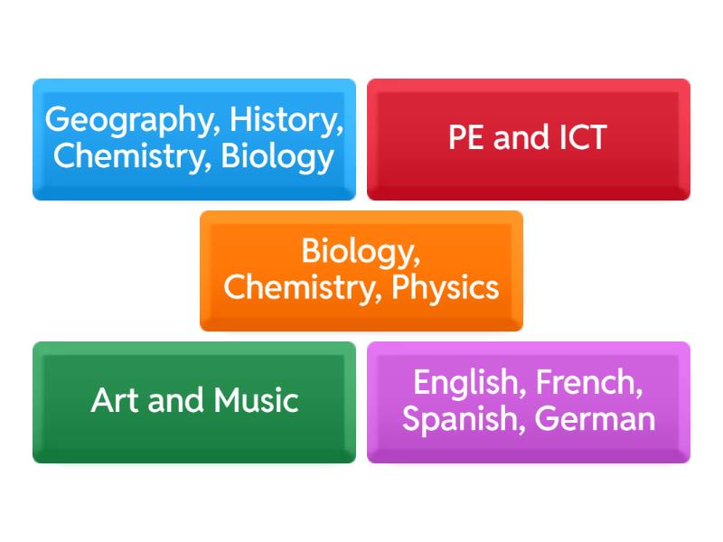 PE and ICT - These subjects are known by their short names, English, French, Spanish, German - These subjects are languages that help you talk to people from different countries, Art and Music - These subjects are studied in the elementary school, Biology, Chemistry, Physics - These subjects help you to understand the natural world , Geography, History, Chemistry, Biology - These subjects end in the sound "y",