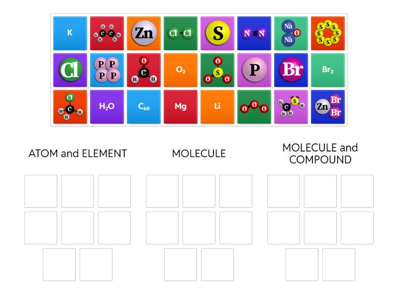 ATOM and ELEMENT: , , , , , Mg, Li, K, MOLECULE : , , , , , C60, Br2, O2, MOLECULE and COMPOUND: , , , , , , , H2O,