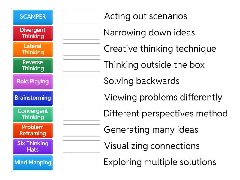 Brainstorming - Generating many ideas, Mind Mapping - Visualizing connections, Lateral Thinking - Thinking outside the box, Divergent Thinking - Exploring multiple solutions, Convergent Thinking - Narrowing down ideas, SCAMPER - Creative thinking technique, Reverse Thinking - Solving backwards, Role Playing - Acting out scenarios, Six Thinking Hats - Different perspectives method, Problem Reframing - Viewing problems differently,