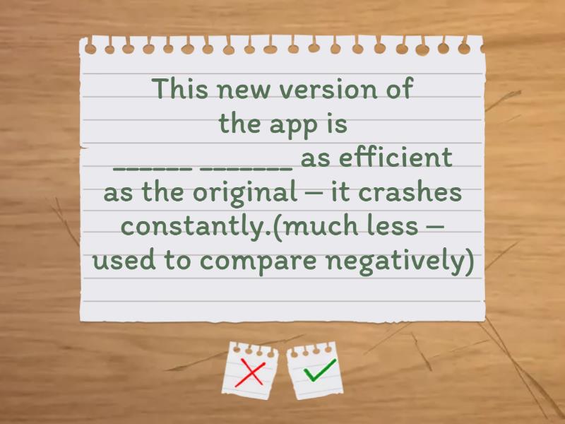 The concert tickets cost ______ €50, but you can get student discounts.(approximately) - in the region of /neighbourhood of , some, roughly, Only ______ students turned up to the rehearsal today, compared to yesterday’s full class.(Only 50%) - half as many, I spent ______ money on food during the trip than I did on accommodation!(double the amount) - twice as much, She's ______ g______ when it comes to music – she could play by ear at the age of five.(extremely talented) - highly gifted, The entrance to the museum is ______ – you don’t have to pay anything(completely free of charge) - entirely free of charge, What he said in the debate was ______ disgraceful – I couldn’t believe my ears(completely/shockingly). - utterly, This new version of the app is ______ _______ as efficient as the original – it crashes constantly.(much less – used to compare negatively) - nothing like as, I’m afraid your argument is ______ convincing as hers – she had actual facts to back it up(not nearly – far from being equally convincing). - nowhere near as, If it rains during the hike, ______ – I love walking in the rain!(all the better) - so much the better, He was the best player ______ – no one else came close(by a large margin). - by a long way, It was ______ exhausting a journey that I could barely keep my eyes open by the time we arrived. - so, The problem wasn’t **______ his being lazy ** ______ his lack of planning.(not because of X, but rather because of Y) - not so much ....as/ but, There were ______ students at the workshop today compared to last week.(50%fewer) - half as many, This year’s exam was ______ tougher than last year’s – most students struggled.( much harder) - far/ a lot/ a great deal/considerably/significantly+tougher(= comparative adjective), I feel ______ more confident about this presentation than the one I gave last month.(a bit more) - slightly/a little more (/ comparative adjective),