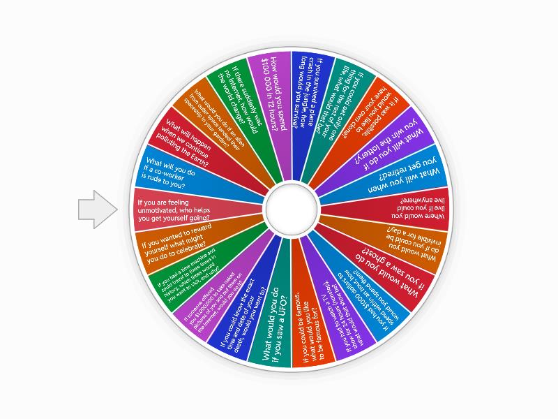 1) What will you do if a co-worker is rude to you? 2) What will happen when we continue polluting the Earth? 3) What would you do if an alien from outer space landed their spaceship in your garden? 4) If there suddenly was no internet, how would the world change? 5) How would you spend $100 000 in 12 hours? 6) If you survived a plane crash in the jungle, how long would you survive? 7) If you could eat only one thing for the rest of your life, what would that be? 8) If it was possible, would you like to have your own clone? 9) What will you do if you win the lottery? 10) What will you when you get retired? 11) Where would you live if you could live anywhere? 12) What would you do if you could be invisible for a day? 13) What would you do if you saw a ghost? 14) If you had $1000 dollars to spend within an hour, how would you spend them? 15) If you had to watch a TV show for 24 hours (nonstop), what would that show be? 16) If you could be famous, what would you like to be famous for? 17) What would you do if you saw a UFO? 18) If you could know the exact time and date of your death, would you want to? 19) If someone offered you $1,000,000 to take naked pictures of you and put them on the Internet, would you do it? 20) If you had a time machine and could travel to three times in history, which times would you want to visit, and why? 21) If you wanted to reward yourself what might you do to celebrate? 22) If you are feeling unmotivated, who helps you get yourself going?