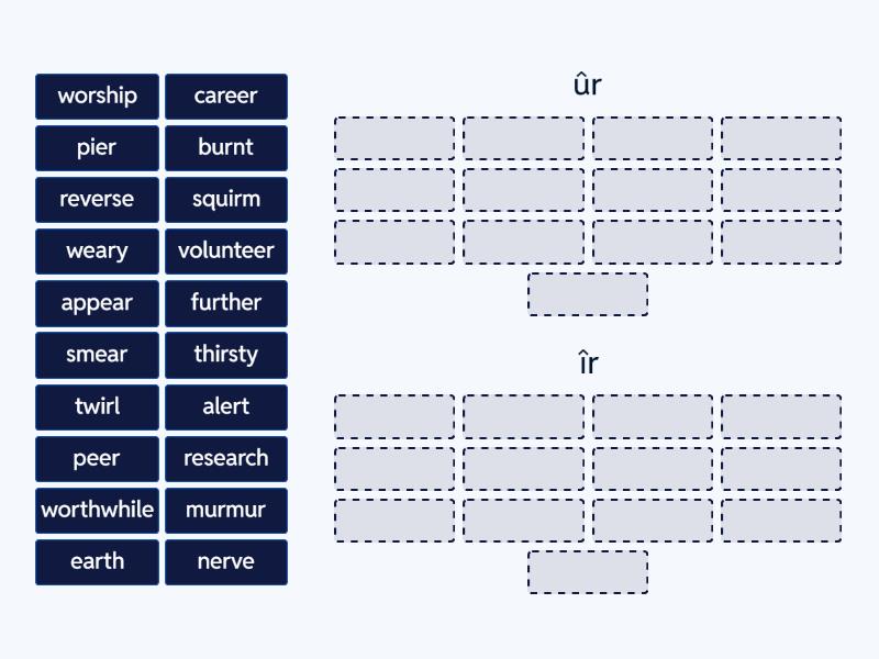 ûr: earth, twirl, burnt, further, worthwhile, nerve, squirm, alert, murmur, reverse, worship, research, thirsty, îr: peer, smear, appear, pier, weary, career, volunteer,