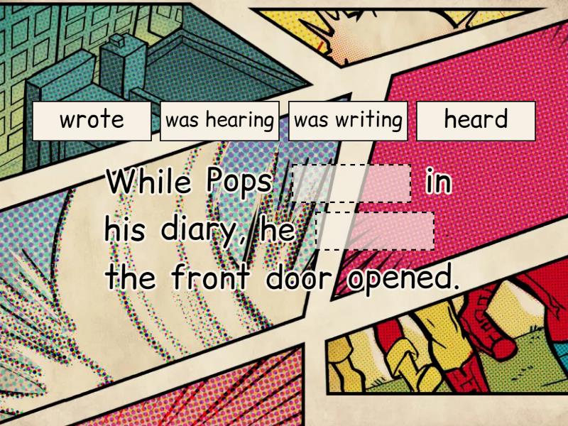 While Pops ____ in his diary, he ____ the front door opened. Pops ____ downstairs when Eva ____: 'Hello, Grandad! It's us!' Mac and Eva ____ in the kitchen when Pops ____. While Mac ____ some sandwiches, Eva fed the dog. Mac and Eva ____ their tea when their mum ____ from work. While mum ____ to Pops, Eva ____ her a sandwich and a cup of tea.