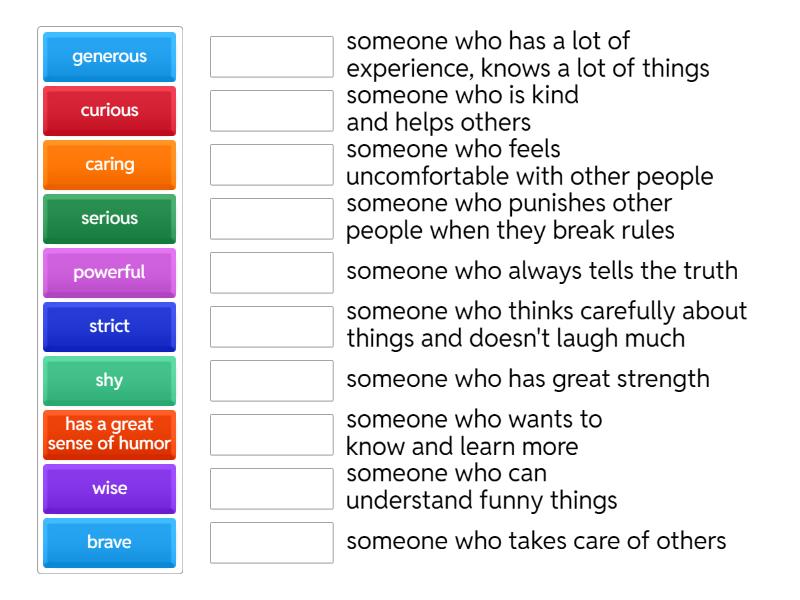 shy - someone who feels uncomfortable with other people, has a great sense of humor - someone who can understand funny things, generous - someone who is kind and helps others, caring - someone who takes care of others, powerful - someone who has great strength, strict - someone who punishes other people when they break rules, serious - someone who thinks carefully about things and doesn't laugh much, wise - someone who has a lot of experience, knows a lot of things, curious - someone who wants to know and learn more, brave - someone who always tells the truth,