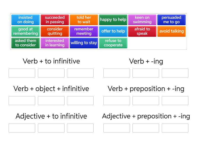 Verb + to infinitive: offer to help, refuse to cooperate, Verb + -ing: avoid talking, consider quitting, remember meeting, Verb + object + infinitive: asked them to consider, told her to wait, persuaded me to go, Verb + preposition + -ing: insisted on doing, succeeded in passing, Adjective + to infinitive: willing to stay, happy to help, afraid to speak, Adjective + preposition + -ing: keen on swimming, interested in learning, good at remembering,