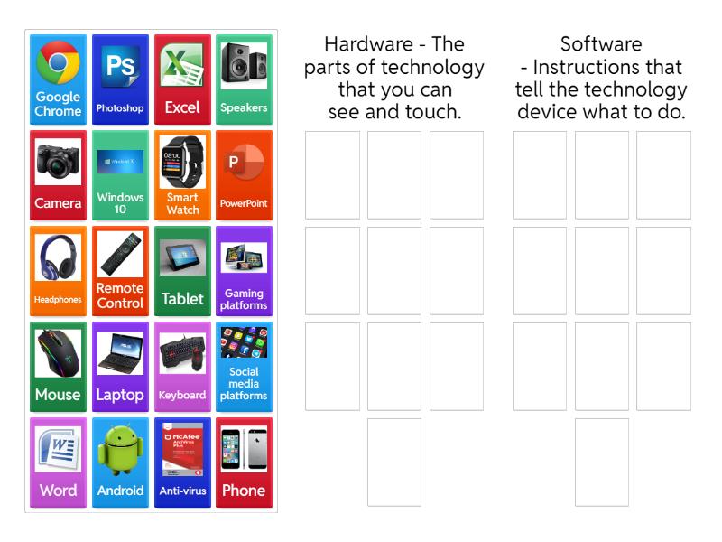 Hardware - The parts of technology that you can see and touch. : Laptop, Mouse, Smart Watch, Phone, Tablet, Headphones, Speakers , Camera, Remote Control, Keyboard, Software - Instructions that tell the technology device what to do. : Google Chrome, Word , PowerPoint, Excel, Photoshop, Anti-virus , Social media platforms, Android , Windows 10, Gaming platforms,