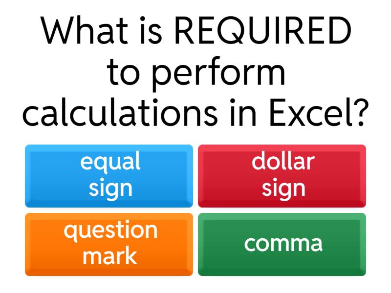 1) What is REQUIRED to perform calculations in Excel? a) equal sign b) dollar sign c) question mark d) comma 2) Which of the following is a formula in Excel? a) 3 + 4 = 7 b) 7 = 3 + 4 c) 3+4 = d) = 3 + 4 3) Which of the following is a mathematical function in Excel? a) SUM = 3 + 4 = 7 b) =SUM(3,4) c) =(SUM = 3 + 4 = 7) d) = 3 + 4 4) How many arguments are in the equation 3 + X - 12? a) 0 b) 2 c) 3 d) 15 5) If A1 = 2 and B 1 = 3 then what is the result of =A1+B1? a) 0 b) 5 c) 23 d) 1213 6) What is the answer to the following function: =SUM(19,000 + 22)? a) 19,022 b) 19,000 c) 1922 d) 41 7) How many arguments are in the following function: =SUM(19,000 + 22)? a) 1 b) 2 c) 3 d) none 8) What is the answer to the following function: = SUM(12,33,10)? a) 123310 b) 123,310 c) 55 d) Not enough information to answer the problem