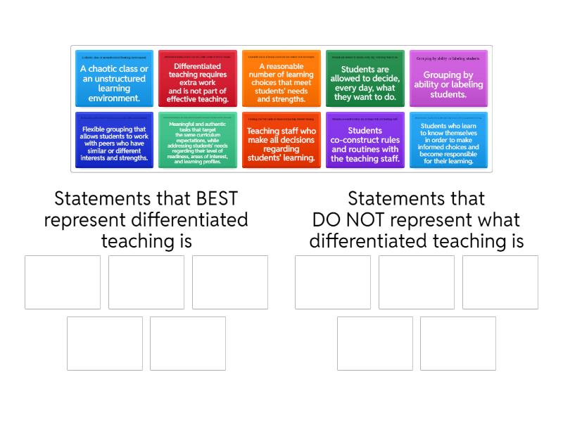 Statements that BEST represent differentiated teaching is: A reasonable number of learning choices that meet students' needs and strengths., Meaningful and authentic tasks that target the same curriculum expectations, while addressing students' needs regarding their level of readiness, areas of interest, and learning profiles., Students who learn to know themselves in order to make informed choices and become responsible for their learning., Students co-construct rules and routines with the teaching staff., Flexible grouping that allows students to work with peers who have similar or different interests and strengths., Statements that DO NOT represent what differentiated teaching is: Teaching staff who make all decisions regarding students' learning., Students are allowed to decide, every day, what they want to do., Differentiated teaching requires extra work and is not part of effective teaching., A chaotic class or an unstructured learning environment., Grouping by ability or labeling students.,