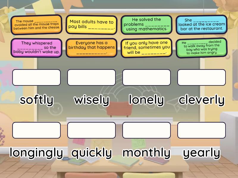 If you only have one friend, sometimes you will be ________. - lonely, He solved the problems ________ using mathematics. - quickly, She _________ looked at the ice cream bar at the restaurant. - longingly, Most adults have to pay bills ________. - monthly, Everyone has a birthday that happens __________. - yearly, They whispered _________ so the baby wouldn't wake up. - softly, The mouse __________ avoided all the mouse traps between him and the cheese. - cleverly, He _________ decided to walk away from the boy who was trying to make him angry. - wisely,
