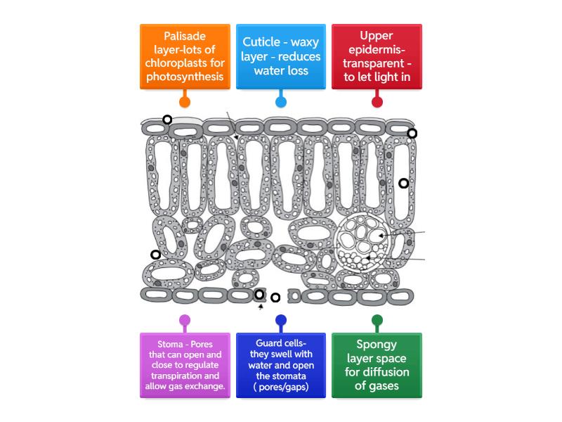Cuticle - waxy layer - reduces water loss, Upper epidermis- transparent - to let light in, Palisade layer-lots of chloroplasts for photosynthesis, Spongy layer space for diffusion of gases, Stoma - Pores that can open and close to regulate transpiration and allow gas exchange., Guard cells- they swell with water and open the stomata ( pores/gaps).