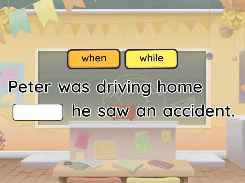 Peter was driving home ____ he saw an accident. I was making the cake, ____ the dog came into the room. Thomas was trying to fix his car ____ his sister was watching him. ____ the doorbell rang, I was having a shower. Michael was playing videogames ____ Sarah came in. My children were sleeping ____ I the phone. I was doing homework ____ I was watching TV. I was having dinner ____ my dad arrived He was working ____ his was listening to music He was walking back home ____ he heard someone screaming.