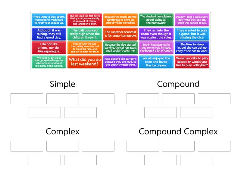 Simple: The student complained about doing all the homework., We slept in, got up at noon, played video games all afternoon, and went to a party in the evening., We all enjoyed the cake and loved the ice cream., The weather forecast is for snow tomorrow., What did you do last weekend?, Compound: The car sped too fast down the icy road; consequently, it spun out of control and landed in a ditch., They wanted to play a game, but it was missing the dice. , Soojin had planned to buy some fruit; instead, she bought a lot of candy., Would you like to play soccer, or would you like to play volleyball?, I do not like onions, nor do I like asparagus., Complex: Although it was raining, they still had a good day., The ball bounced really high when the children threw it., They ran into the room even though it was against the rules., Because the roads are too dangerous to drive on, school will be cancelled., If you want to play sports, you need to work hard to keep your grades up., Compound Complex: Kate doesn't like cartoons because they are loud, so she doesn't watch them., She likes to sleep in, but she can get up early if she has to work., Because the dog started barking, the cat ran away, and I couldn't catch her., Even though she was tired, Abby knew she had to finish the race, and she ran to meet her team, Usually I take a walk every day while the sun sets, but it was raining today.,
